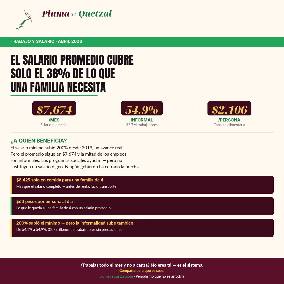 La conexión entre diésel e inflación no es teórica. La canasta alimentaria del Coneval cuesta $2,106.45 por persona al mes en abril de 2026. Para una familia de cuatro, eso son $8,425 pesos — más que el salario promedio de $7,674.
